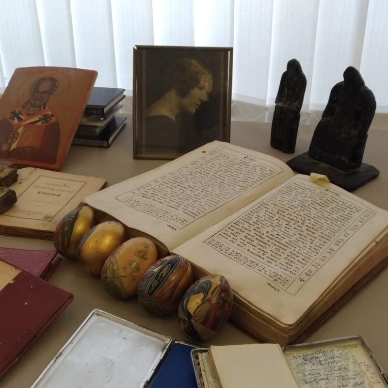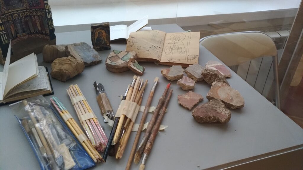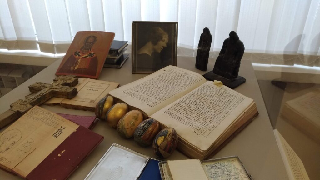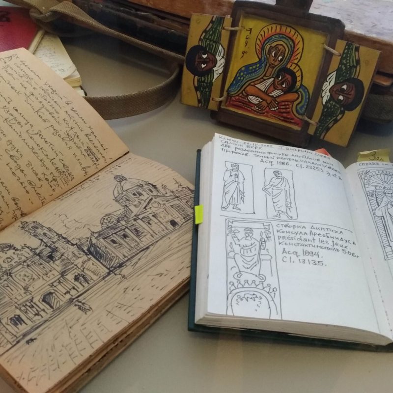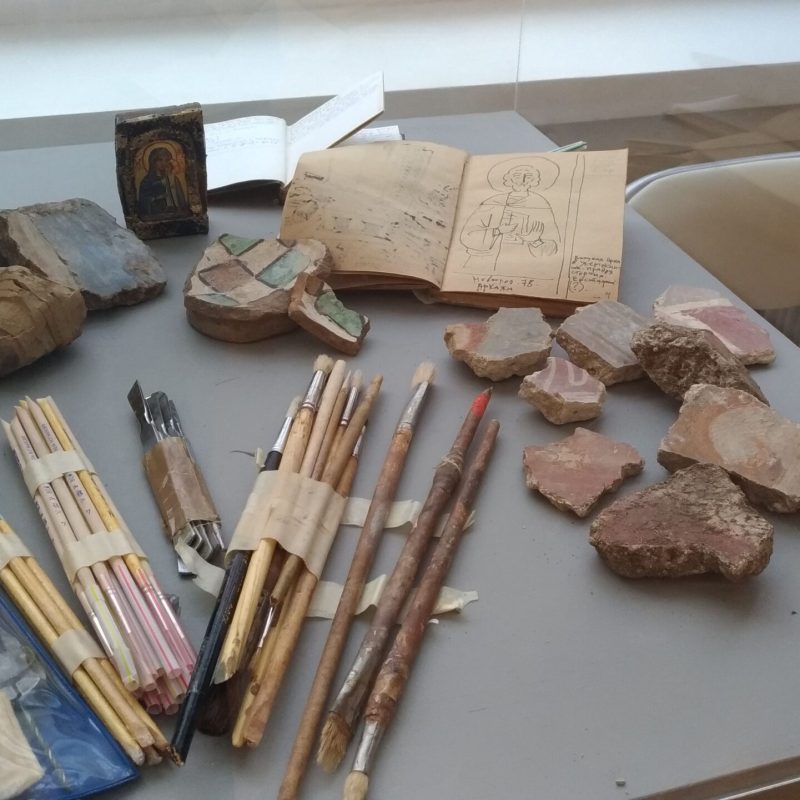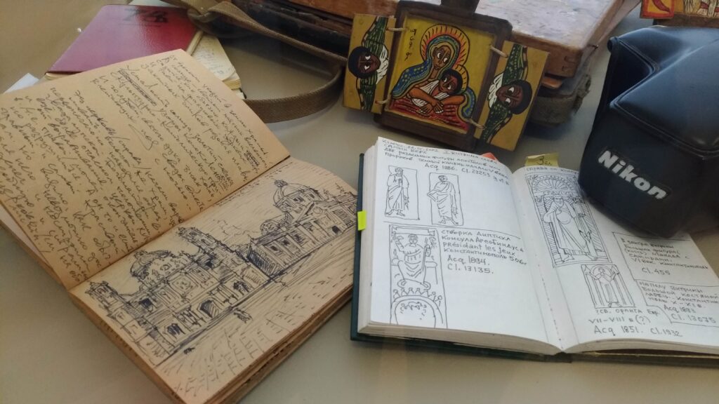 In alcune vetrine sono raccolti oggetti che documentano la vastità dei suoi interessi: piccoli frammenti di pittura ad affresco raccolti a suo tempo nelle chiese in rovina, calchi di piccoli rilievi, croci-encolpi, uova pasquali decorate, e poi l’inseparabile Nikon che aveva acquistato in Italia, i pennelli, i taccuini su cui fissava paesaggi, fisionomie, citazioni, su cui annotava – visitando chiese e musei – ciò che gli serviva per arricchire le pubblicazioni sulla simbologia che erano tra gli obiettivi fondamentali che si prefiggeva di realizzare, e in buona parte ha realizzato, come contributo alle generazioni future.