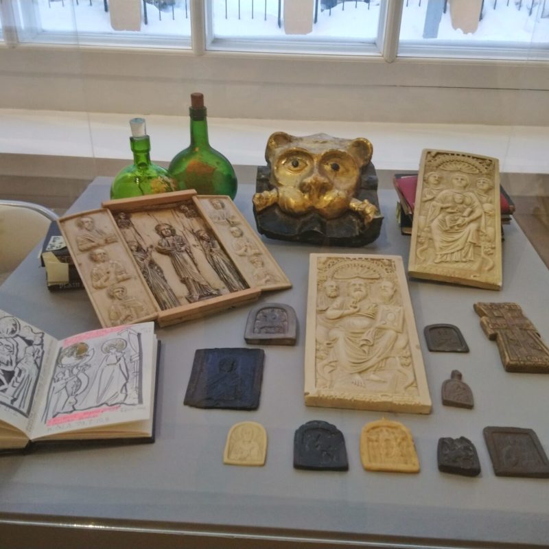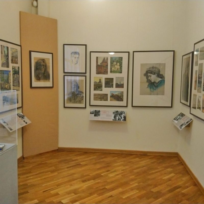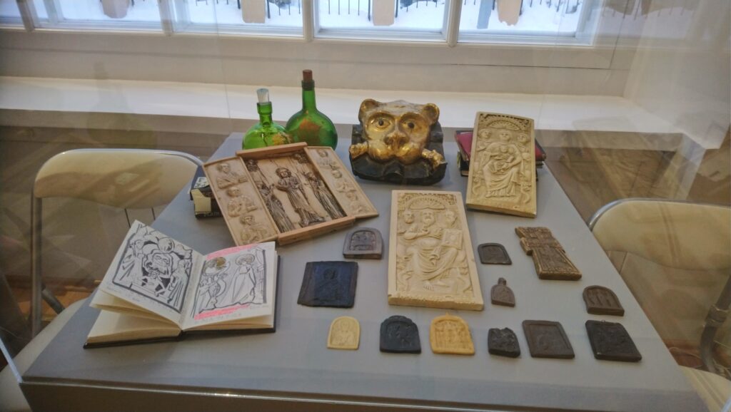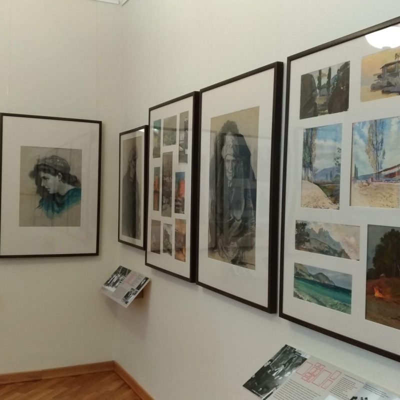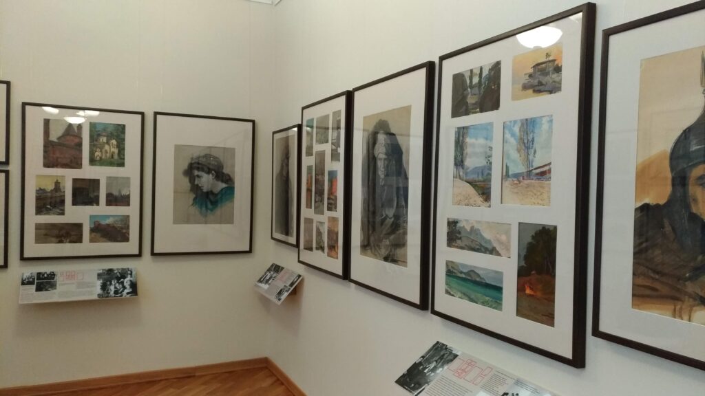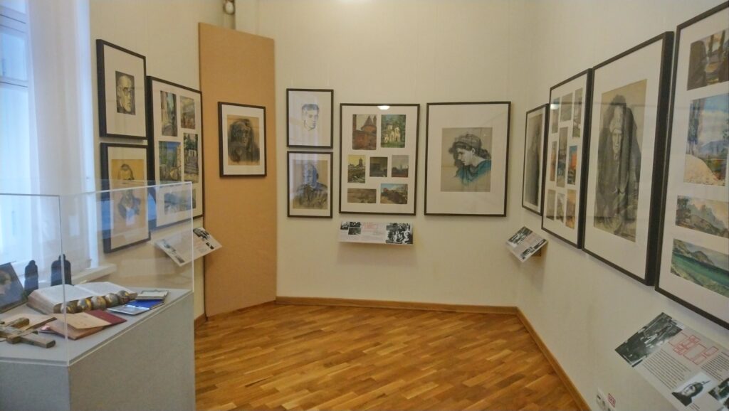 In alcune vetrine sono raccolti oggetti che documentano la vastità dei suoi interessi: piccoli frammenti di pittura ad affresco raccolti a suo tempo nelle chiese in rovina, calchi di piccoli rilievi, croci-encolpi, uova pasquali decorate, e poi l’inseparabile Nikon che aveva acquistato in Italia, i pennelli, i taccuini su cui fissava paesaggi, fisionomie, citazioni, su cui annotava – visitando chiese e musei – ciò che gli serviva per arricchire le pubblicazioni sulla simbologia che erano tra gli obiettivi fondamentali che si prefiggeva di realizzare, e in buona parte ha realizzato, come contributo alle generazioni future.