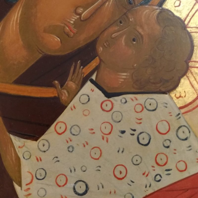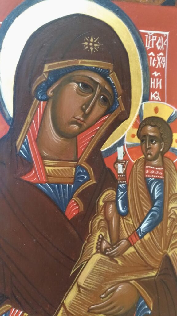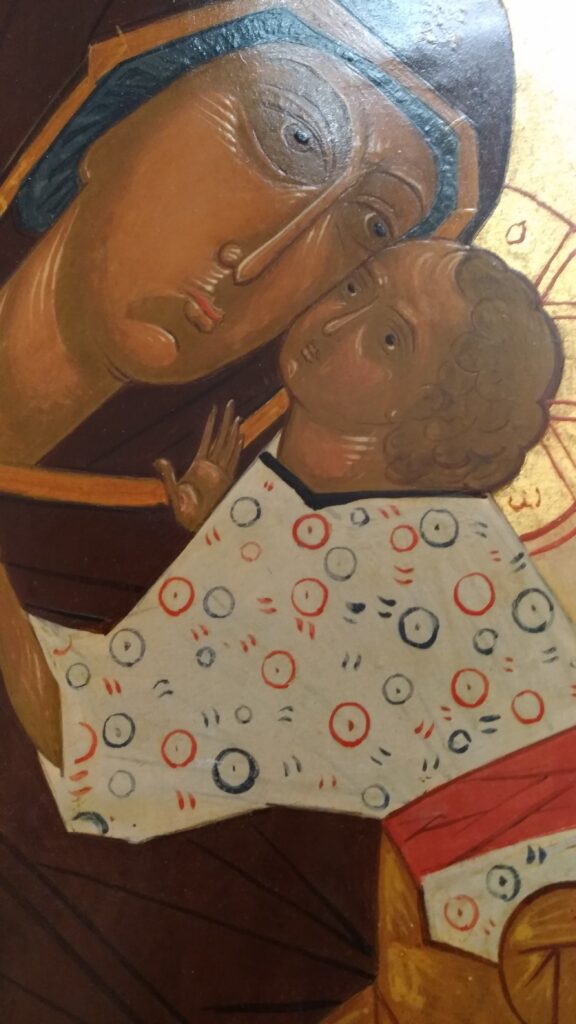 Infine, all’interno della mostra una posizione di particolare rilievo spetta all’icona della Madre di Dio Glykophilousa, un’opera bizantina del XIV secolo appartenente a una collezione privata e restaurata da Ovčinnikov negli anni ’90 in Italia, a Villa Ambiveri, di cui esiste una copia-ricostruzione nella cappella. Tornato a Mosca, il maestro volle dipingere una copia di quest’icona anche per se stesso.