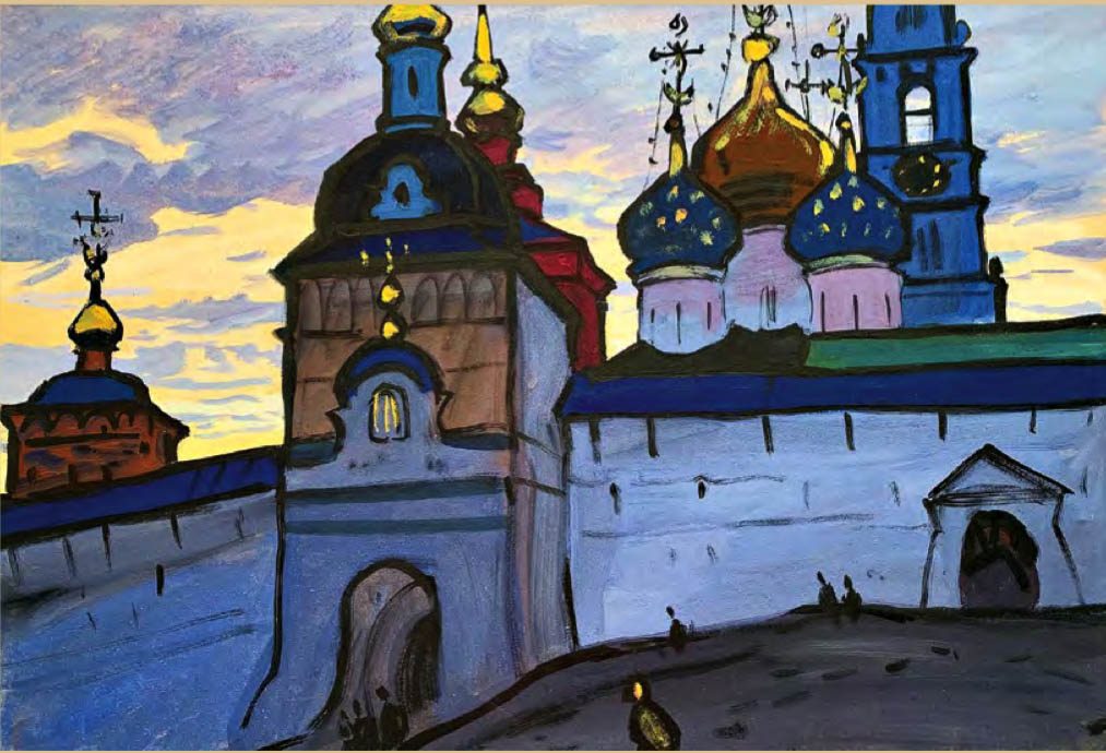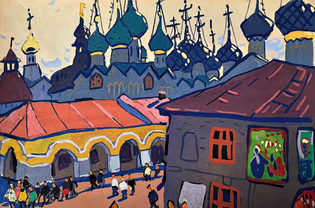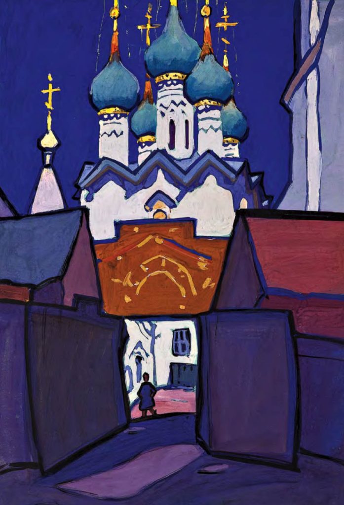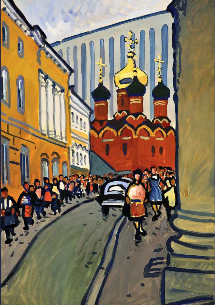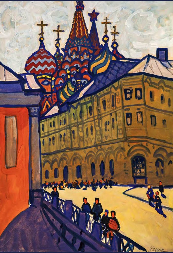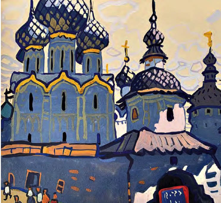 Straordinario come l’artista sia stato in grado di elaborare, dalla fine degli anni ’50 al 1971 – in un decennio tutt’altro che facile per la cultura cristiana, tra l’acuirsi delle repressioni chruščeviane nei confronti delle comunità cristiane e la successiva «stagnazione» – dei cicli dedicati alle antiche città russe, di cui dipinge (come amava dire lui stesso) «ritratti» ad acquarello e a gouache, le cui dominanti sono indubbiamente le chiese. Un posto particolare nel «ciclo russo» di Chimič spetta al Cremlino di Rostov (cui è dedicato il calendario 2021 di Russia Cristiana), edificato nel XVII secolo dal metropolita Iona come immagine della Gerusalemme celeste. Con ogni probabilità l’artista, in epoca sovietica, non poteva essere a conoscenza dei particolari di questa vicenda e delle concezioni teologiche che avevano guidato il vescovo, eppure – fa notare Sorokin – i suoi quadri non ci parlano delle vestigia di un’epoca tramontata, ma ci mostrano questo straordinario complesso architettonico hic et nunc, come un luogo di vita, di una Presenza.
