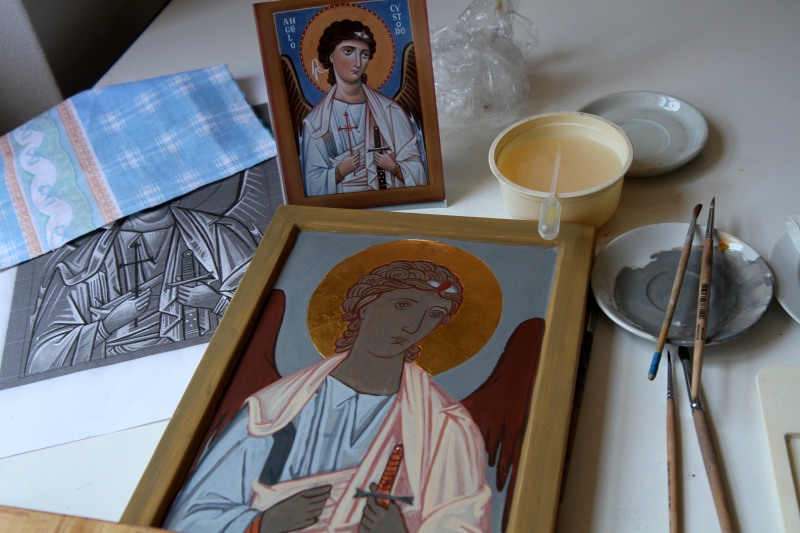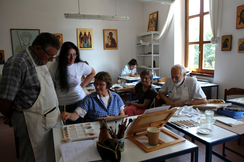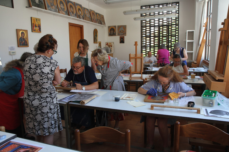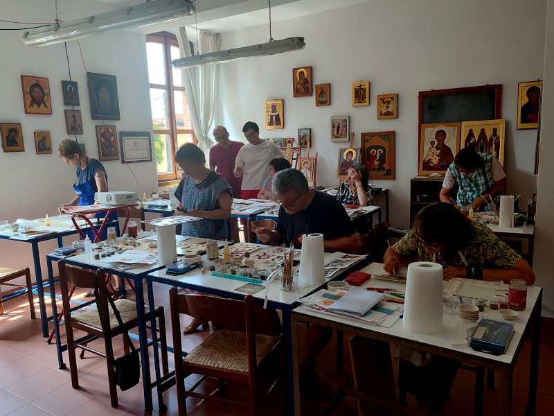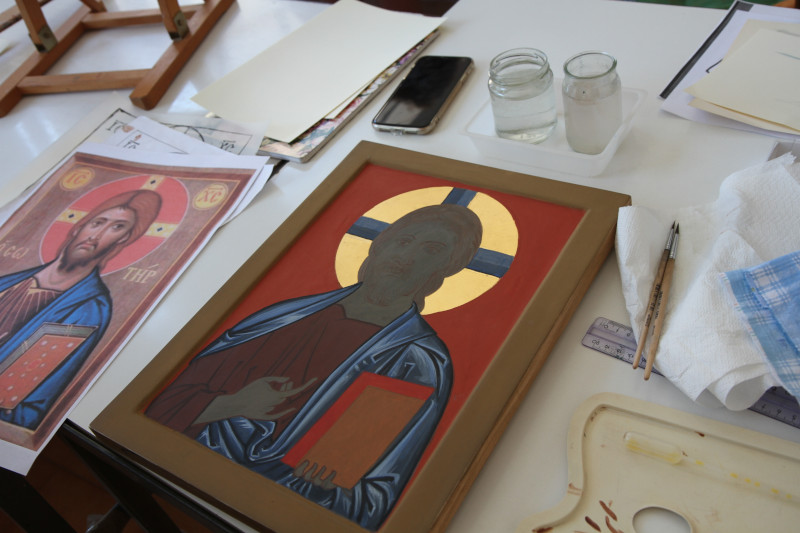 I corsisti del primo anno si sono cimentati in esercitazioni grafiche, di composizione, sull’uso dei materiali (tavola e colori), al fine di acquisire le abilità tecniche di base del linguaggio pittorico e simbolico dell’icona, e hanno studiato il valore del calco per il lavoro iconografico. Gli allievi che l’estate scorsa avevano iniziato a lavorare sulla tavola e sul disegno, hanno portato a termine l’icona di Cristo pantocratore, una delle più importanti e significative perché aiuta l’iconografo a incontrare e dipingere il volto di Cristo. Gli allievi del corso più avanzato hanno invece approfondito e lavorato sull’iconografia dell’angelo.
