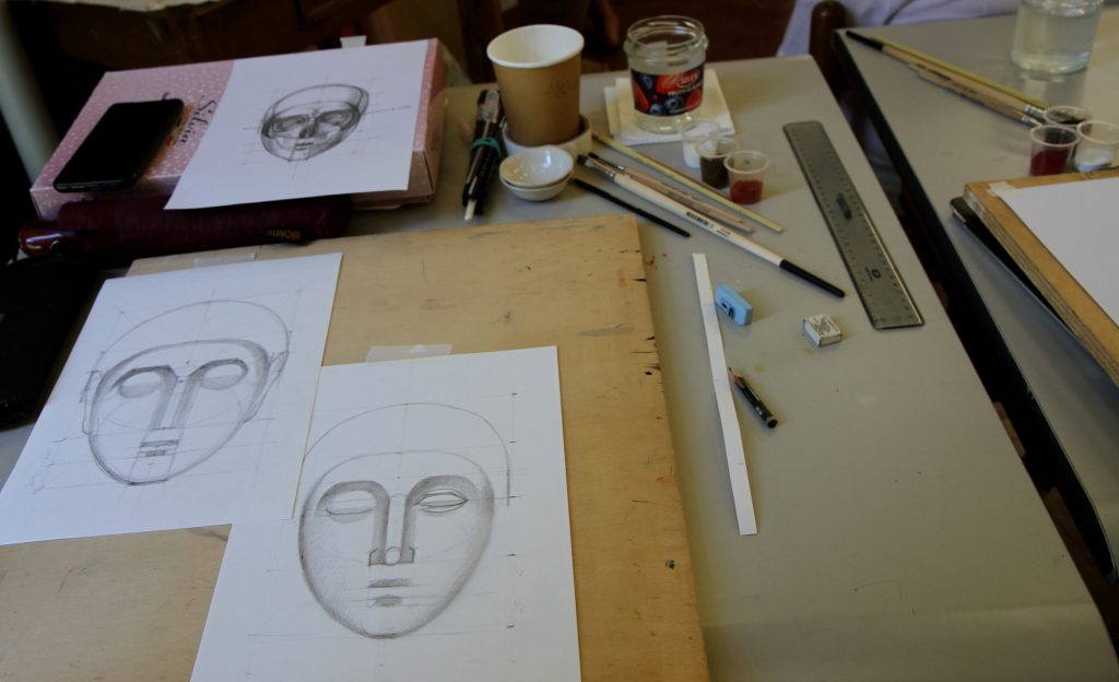 Il corso elementare di disegno dà un’idea delle proporzioni di base del viso, del collo e della figura a mezzo busto. Nel corso base di pittura di icone abbiamo lavorato senza un modello e lo scopo era quello di capire i principi base della costruzione del volto e di essere in grado di disegnarlo, e di poterlo ricostruire anche se qualche elemento è andato perso. Abbiamo disegnato a matita, studiato le peculiarità della lavorazione della tempera all’uovo e dipinto il volto col colore. Il lavoro del corso non implicava la realizzazione di un’icona finita e si basava su un gran numero di esercizi da realizzare con matita e tempera.