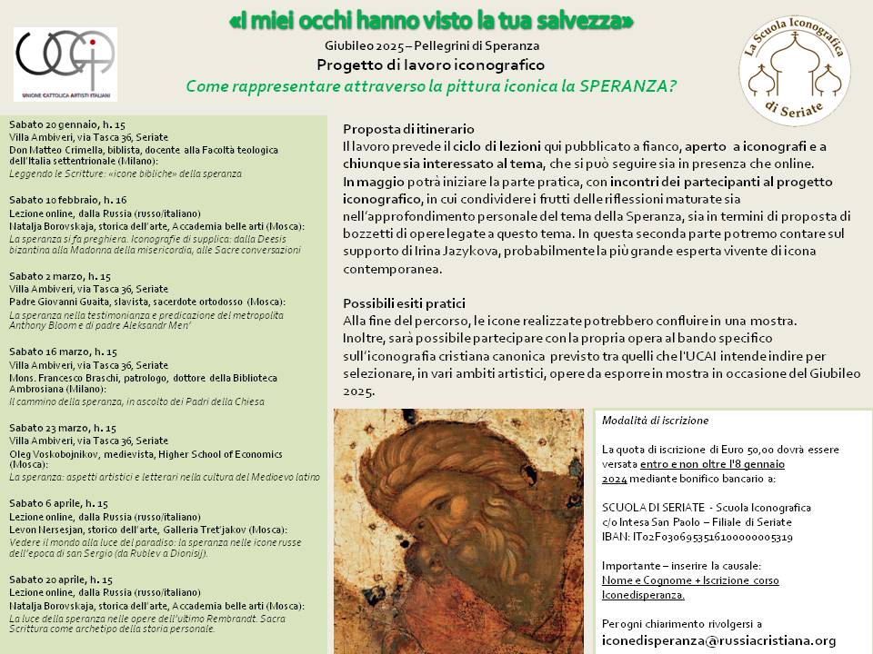 Facendo seguito al fruttuoso lavoro sull’iconografia della Santa Famiglia, ma soprattutto rispondendo all’appello del Santo Padre a prepararci alla celebrazione del Giubileo del 2025, che avrà come motto «Pellegrini di speranza», la Scuola iconografica di Seriate, in collaborazione con l’UCAI (Unione Cattolica Artisti Italiani),propone a tutti gli interessati un nuovo itinerario di riflessione e di impegno creativo sul tema della speranza, che possa sfociare nella creazione di opere iconiche legate alla tradizione e nel contempo espressive delle attese religiose e della fede degli uomini del nostro tempo. Tale, del resto, è stata l’iconografia cristiana di tutte le epoche: lungi dal ridursi a copia meccanica di modelli dati una volta per sempre, ha sempre saputo parlare al cuore dei suoi contemporanei.