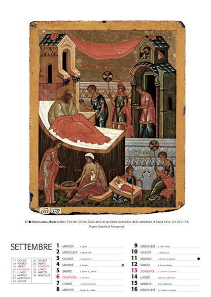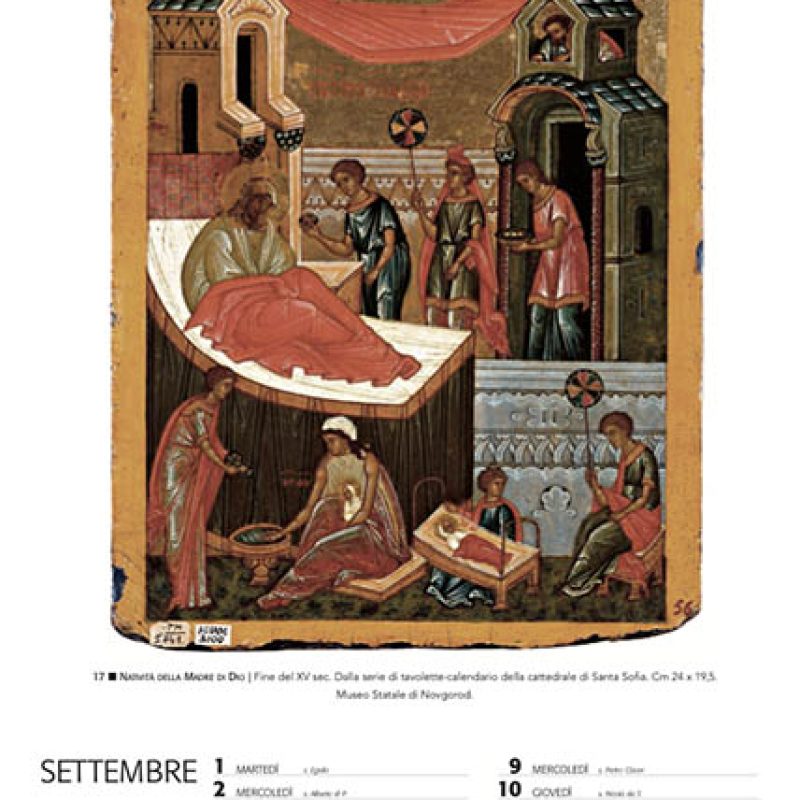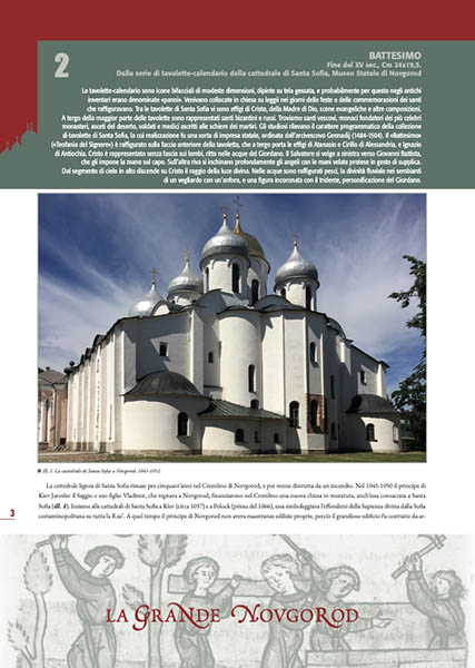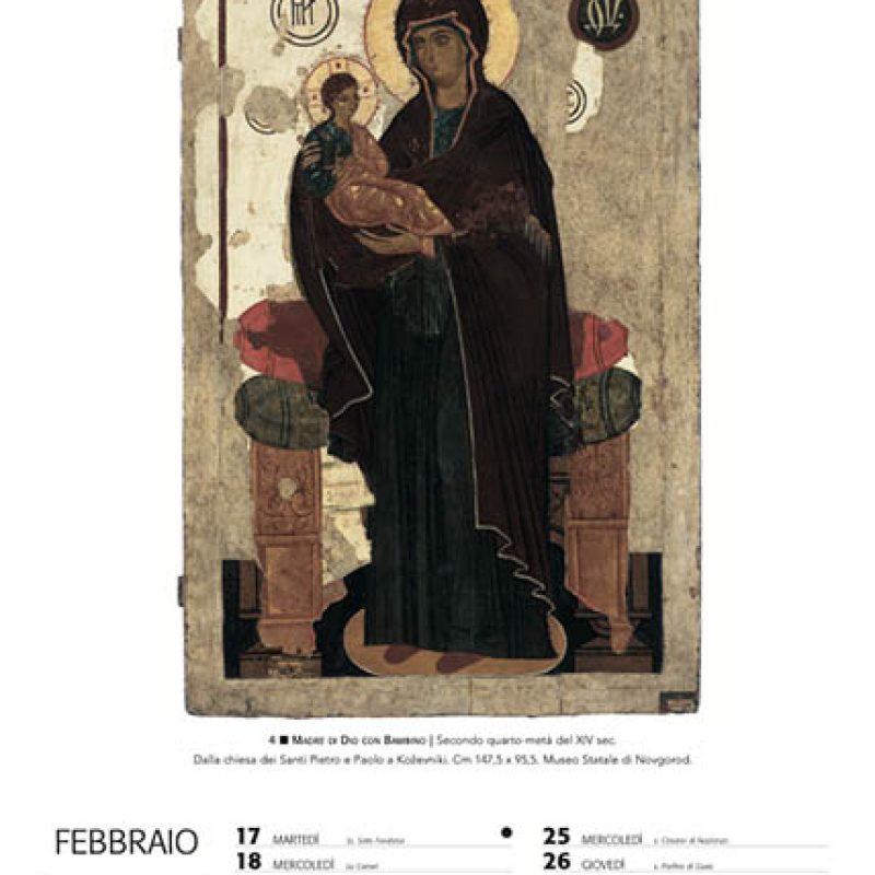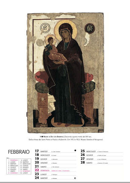 La presente pubblicazione presenta le opere iconiche più pregevoli attualmente conservate nel Museo Statale di Novgorod. Il corredo fotografico dell’album-calendario è arricchito da illustrazioni dei luoghi e degli oggetti sacri, nel cui contesto si è sviluppata questa straordinaria civiltà.