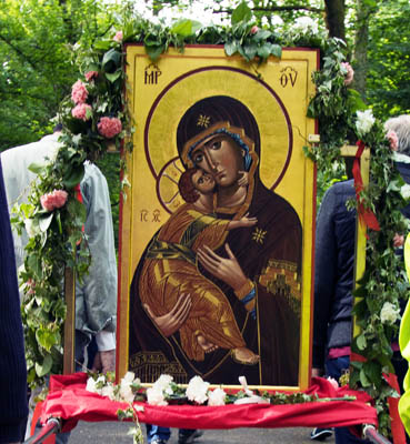 Spesso dicevo a questi miei amici che non vedevo differenza tra il loro impegno e la mia “avventura” alla Scuola di Seriate: lo sguardo che loro hanno verso le persone che incontrano e il mio verso l’icona che sto eseguendo è lo stesso, è lo sguardo ad un mistero che, ad ognuno in una forma diversa, ci interpella, ci commuove, e ci fa muovere, questo mistero ha un nome: Gesù. Perciò quest’anno ho proposto loro di portare in pellegrinaggio l’icona del Pantocratore del Sinai e l’icona della Madre di Dio di Vladimir, che avevo eseguito con l’aiuto dei maestri e in particolar modo di Pavel.