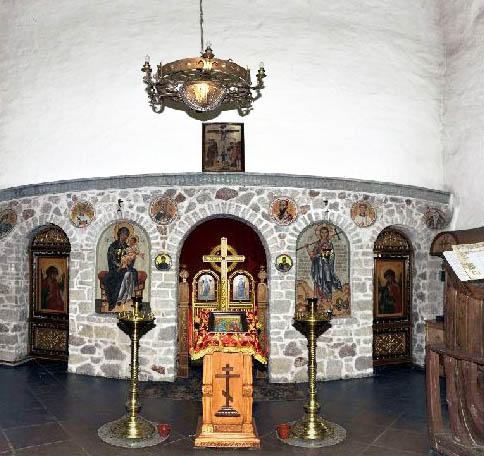 In quest’opera Zinon ha messo a frutto le scoperte fatte in precedenza: la pietra grigia per l’iconostasi viene da Pskov, e le sei icone inserite in altrettante edicole sono assimilabili a «finestre aperte su un altro mondo». Il «Cristo Cosmocratore», assiso sulla sfera celeste, è un’invenzione dell’iconografo? No, è un’antica iconografia bizantina, che si incontra solo raramente nell’iconografia russa antica. La splendida, austera figura della Madre di Dio con Bambino, non appesantita da alcun elemento decorativo, è situata a sinistra delle basse Porte regali, eseguite nella tecnica della doratura a fuoco su metallo. Padre Zinon, in quanto monaco – ritiene Irina Jazykova – ha una mano particolarmente felice nel dipingere le figure dei santi monaci: ai lati esterni dell’iconostasi vediamo Efrem il Siro e Giovanni Damasceno. All’interno di clipei vi sono gli arcangeli, e la costruzione in pietra è coronata da una Deesis a busto di nove figure, delimitata alla base da una stretta cintura di pietra bianca scolpita. «Affreschi e iconostasi contemporanee spesso sono distraenti, qui invece tutto è funzionale alla liturgia e alla contemplazione», ha commentato la relatrice.