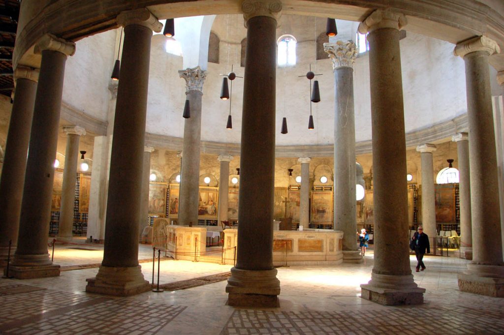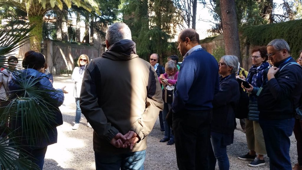 L’abbiamo constatato, in particolare, visitando Santo Stefano Rotondo: una chiesa del V secolo a pianta circolare, costituita in origine da tre cerchi concentrici che iscrivevano nella pianta circolare una croce greca, e che presenta analogie con la pianta della Rotonda (Anastasis) della basilica del Santo Sepolcro a Gerusalemme. A guidarci qui è stato Emanuele Gambuti, giovane esperto dell’Associazione «Pietre vive», che oltre a farci rivivere gli esordi del culto dei martiri e la presenza di papa Gregorio Magno (che qui predicò e al quale viene attribuita la cattedra tuttora conservatasi, un sedile in marmo di epoca romana), ci ha fatto gustare la devozione per i martiri – in primis il Crocifisso – sviluppata nella seconda metà del XVI secolo dai gesuiti lungo tutto il perimetro della chiesa attraverso gli affreschi del Pomarancio e gli scritti di meditazione di sant’Ignazio di Loyola riportati a fianco delle pitture.