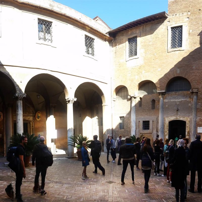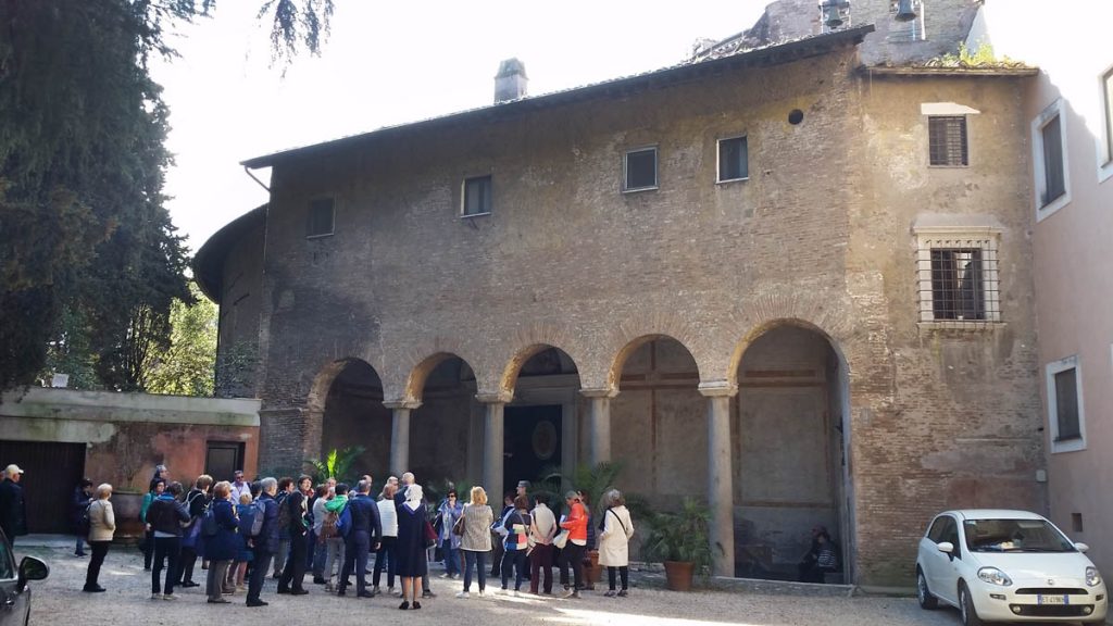 La domenica mattina, visita all’Oratorio di San Silvestro nel complesso dei Santi Quattro Coronati (attualmente monastero agostiniano), affrescato nel 1248 da artisti bizantini. Si tratta di un ciclo di 11 scene pitturiche, che illustrano gli Acta Silvestri con la vita leggendaria dell’imperatore Costantino e la sua conversione attraverso la visione dei Santi Pietro e Paolo. È la riaffermazione dell’autorità papale in un momento in cui il potere imperiale minacciava la stessa istituzione del papato, ma è interessante notare come nella Chiesa l’autorità – nella sua concretezza – si basi sulla persona di Cristo, che campeggia al centro del ciclo pittorico, e degli apostoli Pietro e Paolo a cui Egli affida la sua Chiesa. Proprio a questo bellissimo ciclo di pitture si rifanno gli autori degli affreschi di San Piero a Grado (Pisa), che ci siamo recati a visitare l’anno scorso.