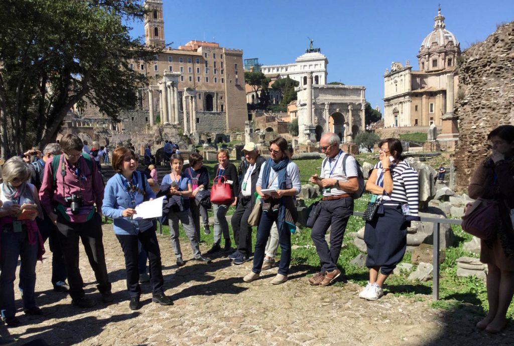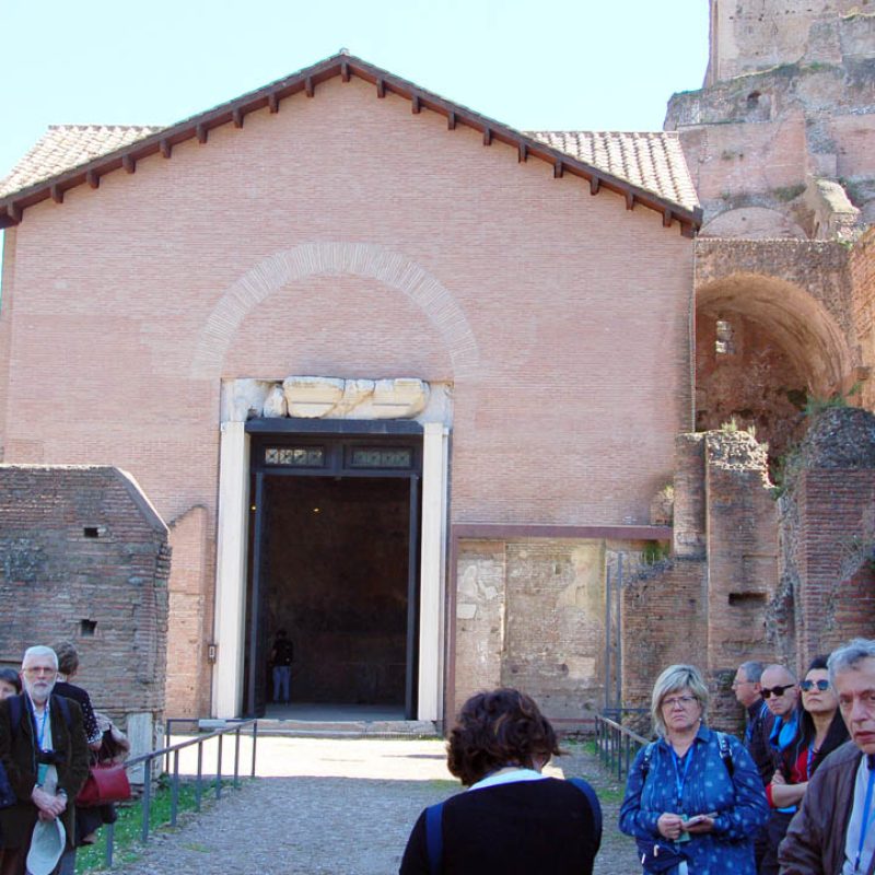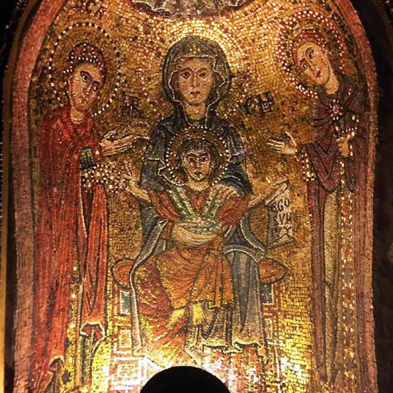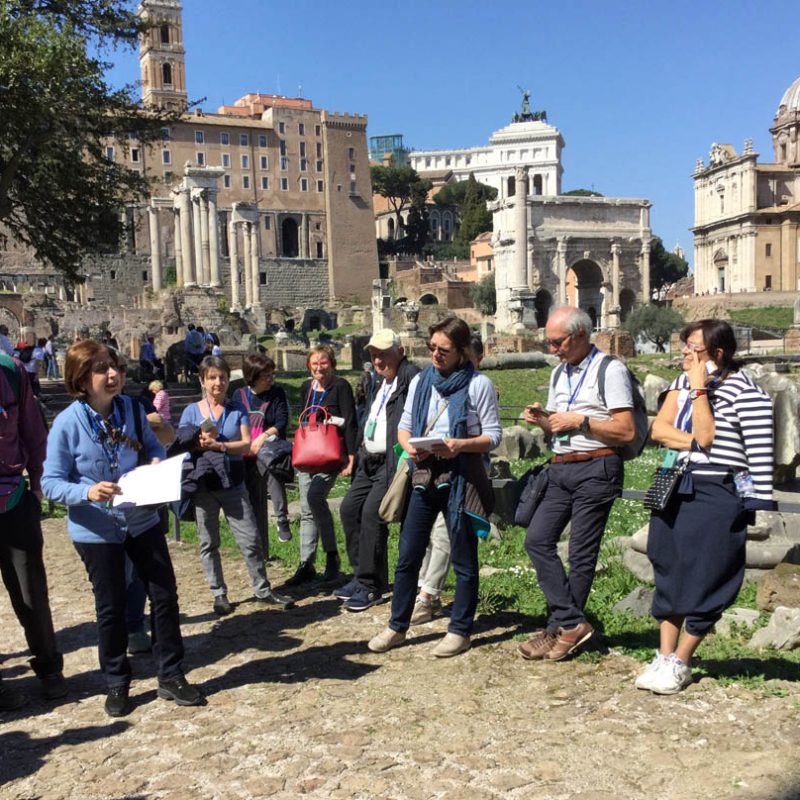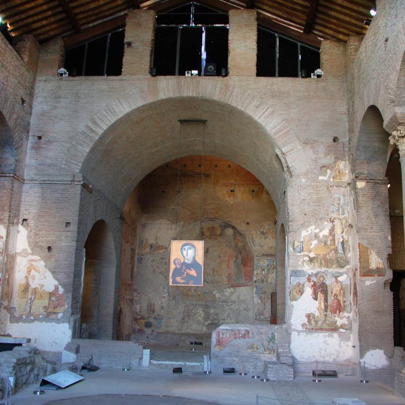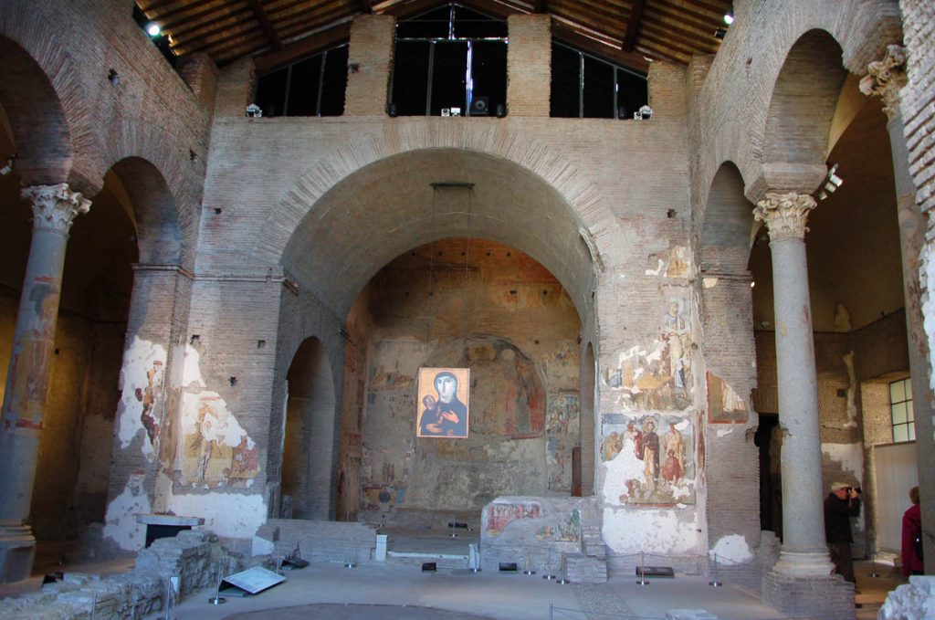 Abbiamo inoltre avuto modo di rilevare come i patrimoni artistici e culturali di Oriente e Occidente possiedano una comune base culturale e religiosa su cui si innestano con il passar del tempo pluriformi peculiarità artistiche e culturali dettate dagli sviluppi storici, e in cui si cristallizzano lentamente quelli che saranno i «canoni» dell’iconografia cristiana. In questo senso, uno dei monumenti più straordinari dell’Alto Medioevo romano è Santa Maria Antiqua ai Fori imperiali, rimasta sepolta per secoli probabilmente in seguito a un terremoto avvenuto nell’847 e riportata alla luce nel 1900. Era collegata alla residenza imperiale e come tale rimanda all’arte aulica bizantina e ne mostra alcuni schemi pittorici. Presenta dipinti parietali che vanno dal VI all’VIII secolo, periodo nel quale era forte l’influsso artistico di Bisanzio su Roma. Qui a farci da guida è stata Maria Luigia Fobelli, docente universitaria di Roma e specialista di Santa Sofia di Costantinopoli. Questa «Cappella Sistina» dell’Alto Medioevo rivela l’estrema attualità di una problematica legata alla definizione di Dio e quindi dell’identità e del destino dell’uomo, che si esprime nelle iconografie sorgive qui conservatesi. All’uscita dai Fori, una breve visita a Santa Maria Nova, dov’è custodita l’icona mariana del VI secolo che in origine si trovava in Santa Maria Antiqua.