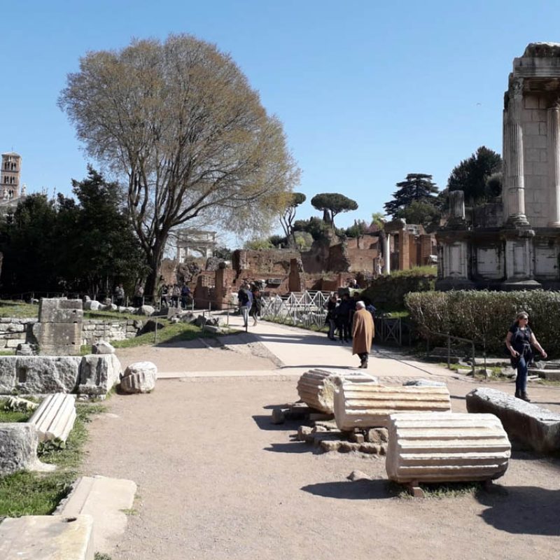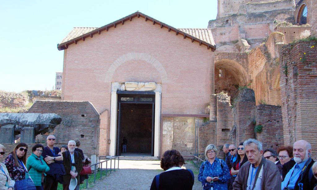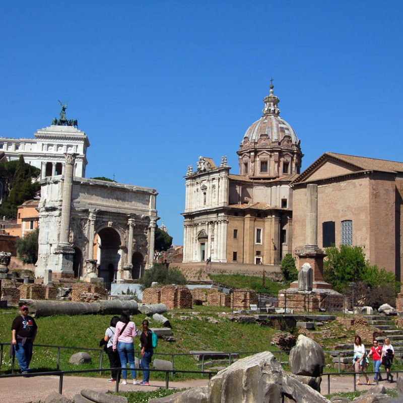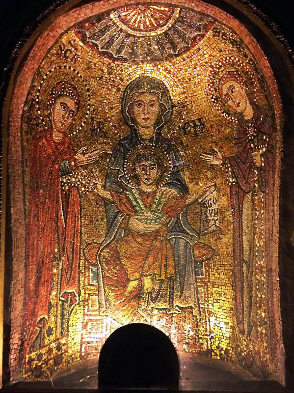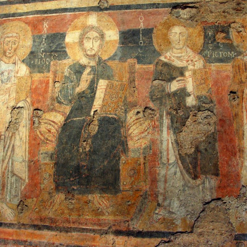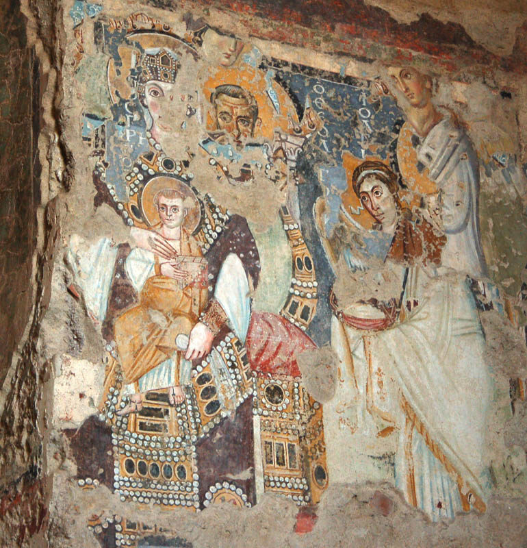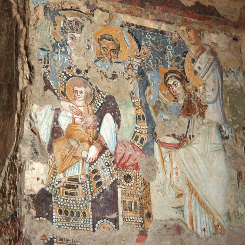 Abbiamo inoltre avuto modo di rilevare come i patrimoni artistici e culturali di Oriente e Occidente possiedano una comune base culturale e religiosa su cui si innestano con il passar del tempo pluriformi peculiarità artistiche e culturali dettate dagli sviluppi storici, e in cui si cristallizzano lentamente quelli che saranno i «canoni» dell’iconografia cristiana. In questo senso, uno dei monumenti più straordinari dell’Alto Medioevo romano è Santa Maria Antiqua ai Fori imperiali, rimasta sepolta per secoli probabilmente in seguito a un terremoto avvenuto nell’847 e riportata alla luce nel 1900. Era collegata alla residenza imperiale e come tale rimanda all’arte aulica bizantina e ne mostra alcuni schemi pittorici. Presenta dipinti parietali che vanno dal VI all’VIII secolo, periodo nel quale era forte l’influsso artistico di Bisanzio su Roma. Qui a farci da guida è stata Maria Luigia Fobelli, docente universitaria di Roma e specialista di Santa Sofia di Costantinopoli. Questa «Cappella Sistina» dell’Alto Medioevo rivela l’estrema attualità di una problematica legata alla definizione di Dio e quindi dell’identità e del destino dell’uomo, che si esprime nelle iconografie sorgive qui conservatesi. All’uscita dai Fori, una breve visita a Santa Maria Nova, dov’è custodita l’icona mariana del VI secolo che in origine si trovava in Santa Maria Antiqua.