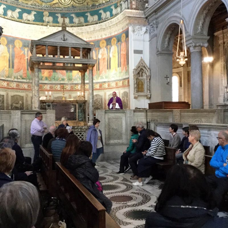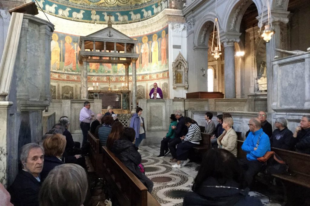 Da ultimo, visita a Santa Prassede, con i suoi splendidi mosaici. È una delle chiese volute da papa Pasquale I (IX sec.) per tener desto il culto dei martiri (di Prassede, sorella di Pudenziana, come lei morta martire, si dice che andasse sui luoghi del martirio dei suoi contemporanei per raccoglierne con una spugna il sangue prezioso – seme di nuovi cristiani). La ripresa del mosaico per opera di papa Pasquale è dovuto all’accoglienza di Roma agli artisti che fuggivano in quel periodo da Bisanzio in seguito alle persecuzioni iconoclaste.